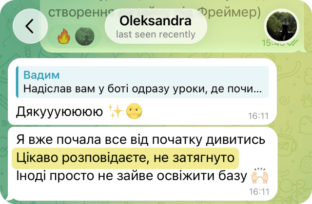 Якщо в процесі проходження уроків у вас виникнуть запитання, ви завжди зможете їх задати в Телеграм чаті