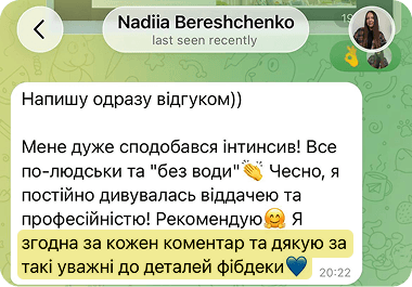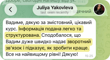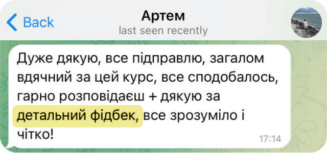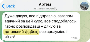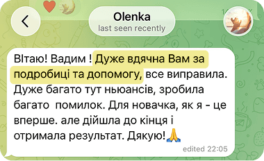Після виконання кожного домашнього завдання ви отримуєте персональний відео-розбір вашої роботи. Протягом 10–20 хвилин я перевіряю, що вже зроблено, де є помилки і як їх виправити.